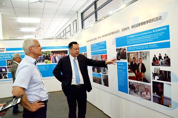 Nach der Besprechung besichtigten sie gemeinsam die Ausstellung über den 30-jährigen Aufbau der Universität Hefei unter der deutsch-chinesischen Kooperation. Daran nahmen unter anderem Herr Jia Feng, Direktor und Herr Sun Jianan, Vizedirektor des International Offices der Universität Hefei, Herr Wang Jianbin, Dekan des Instituts für Germanistik und Direktor des Deutschen Forschungszentrums an der Fremdsprachenuniversität Beijing, sowie Frau Zhang Xiaohui, Direktorin der Arbeitskomitee für Konfuzius-Instituts teil.