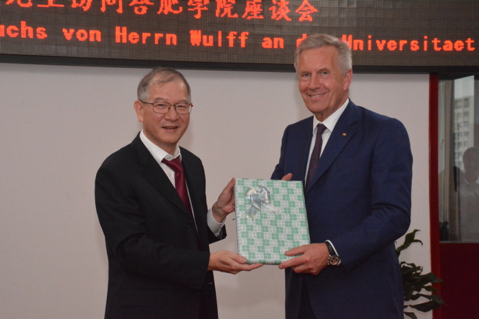 Herr Wulff erinnert sich gerne an die Geschichte der Zusammenarbeit zwischen der Provinz Anhui und Niedersachsen als Partnerprovinz bzw. Partnerbundesland und an die persönlichen Gefühle bei seinen früheren Besuchen der Universität Hefei. Er sagte, dass die chinesisch-deutsche Zusammenarbeit in den letzten Jahren immer enger geworden sei, insbesondere sei die Interaktion zwischen jungen chinesischen und deutschen Studierenden immer häufiger geworden. Er hoffte, dass beide Seiten weiterhin einen intensiven Austausch, gegenseitiges Vertrauen und gegenseitiges Verständnis sowie eine für beide Seiten vorteilhafte Entwicklung haben würden, und wünschte sich, dass diese innovative chinesisch-deutsche Kooperationsform des Schulbetriebs in dem Volkswagen-Institut einen noch größeren Erfolg haben werde.