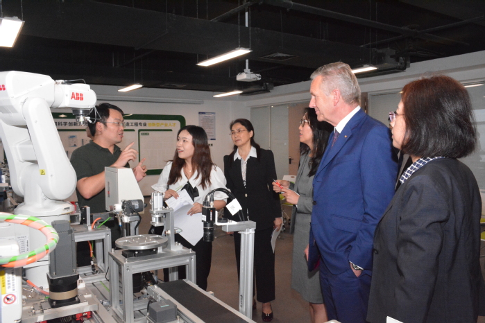 Herr Wulff und seine Delegation besuchten auch die Ausbildungsplattform des Volkswagen-Instituts und informierten sich über den Aufbau der Fächer, das modulare Curriculum, die praktische Ausbildung und den Unterricht im Labor für die Zustandsbewertung multimodaler Geräte im Anwendungs- und Innovationszentrum für intelligente Fertigungssystem und im Anwendungszentrum für digitale Zwillingstechnologie und -technik. Er bestätigte die Positionierung der Universität Hefei als lokal, anwendungsorientiert und international.