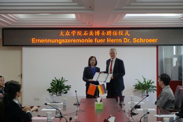 Dr. Klaus Schröer dankte der Hefei-Universität für das in ihn gesetzte Vertrauen und die Einstellung von Sonderprofessor. Er sagte, er freute sich sehr, wieder nach China zurückzukehren und mit seinem Fachwissen zur Zusammenarbeit zwischen der Universität Hefei und dem Volkswagen Konzern beizutragen. In Zukunft wird er als Bindeglied die intensive Zusammenarbeit zwischen dem Volkswagen Konzern und der Universität Hefei fördern und seine reiche praktischen Erfahrungen und sein innovatives Denken in den Unterricht einbringen, um der Universität Hefei neue Impulse zu geben und die Qualität der Talentförderung umfassend zu verbessern.